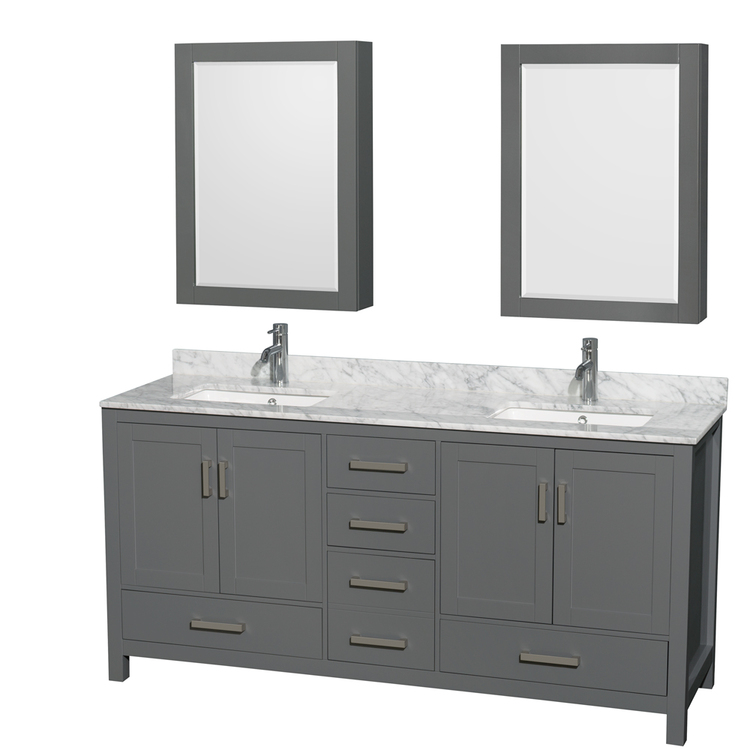 Wyndham Collection Sheffield 72 Inch Double Bathroom Vanity in Dark Gray, White Carrara Marble Countertop, Undermount Square Sinks, and Medicine Cabinets