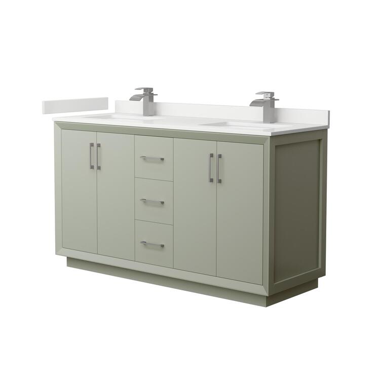 Double Sink Bathroom Vanity Unit With Light Green Quartz Countertop and Brushed Nickel Trim